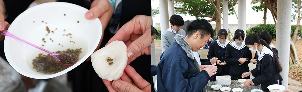 福岡放送や福岡工業大学付属城東高校の生徒など、「博多湾NEXT会議」の関係者約20人が参加し、約5000粒のアマモの種子を、生分解性の寒天粘土に包んでいきます。