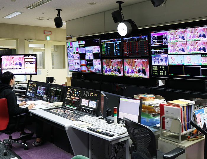 FBSで制作した番組、キー局などから送られてくる番組、CMは、ここからデジタル、ワンセグ(携帯用)の2種類の放送に分けられて、発信されていきます。と同時に、番組が正常に放送されているか24時間体制でチェック。放送を支える重要なデジタル機器が集められたスペースは土足厳禁。 室温も1年中一定に保たれています。